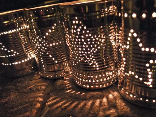 Para fazer estas luzes terá limpar as latas de alimentos e metê-las no congelador. Isto vai fazer com que seja muito mais fácil fazer furos nelas. A ideia é realizar um desenho nas latas e, assim quando introduzir a vela no seu interior, conseguirá uma decoração bem legal.