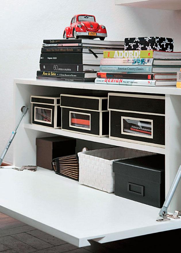 Caso sua estante tenha um módulo fechado, não jogue tudo lá para dentro. Mantenha a organização também em gavetas e portas, utilizando caixas de arrumação. Pode até etiquetas as caixas na frente, para uma mais fácil identificação e localização dos objetos.