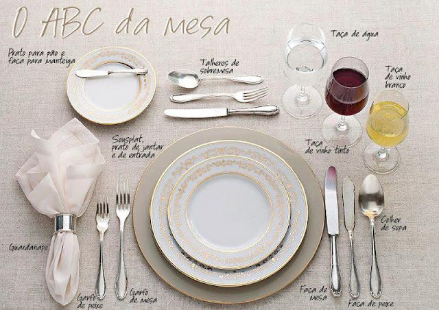 Diante de cada pessoa coloca-se um prato raso, sobre o qual se coloca outro prato fundo para a sopa (se houver). Devem ser colocados a uns dois centímetros da beirada da mesa. À direita coloca-se a colher e a faca de carne, a faca junto ao prato e a colher na parte de fora. Ao lado esquerdo do prato coloca-se o garfo.