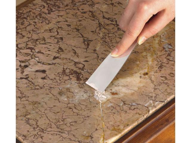 Quando estiver seco, retire a parte que sobrou raspando com uma lâmina de barbear. Deste modo, conseguirá que a superfície fique totalmente uniforme. Mas antes de tudo, tenha muito cuidado para não riscar o mármore com a lâmina de barbear, faça isso sempre pouco a pouco.