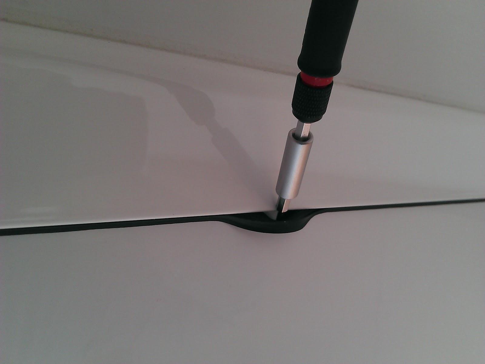 Afrouxe a fita. Pode usar uma chave de fenda grossa. Introduza na ranhura que encontrará colada na parede. Isto fará que se bloqueie a mola e a fita se fixe, com o qual será impossível que possamos puxá-la.