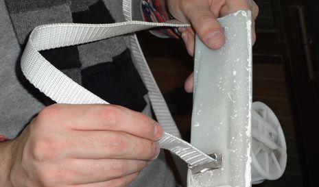 Solte os cabos da fita de fixação. Suba a persiana um pouco com a mão pela parte de baixo e apoie-a em um calço. Isto facilitará para extrair do painel da persiana a lâmina estragada. Observará que a vareta estragada tem presos os tirantes do rolo.