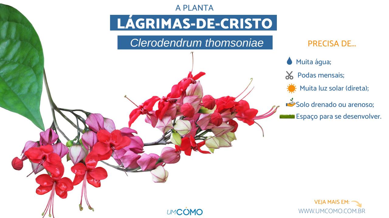 As lágrimas-de-cristo ou Clerodendrum thomsoniae são plantas trepadeiras com caule semilenhoso, pertencentes à família Verbenaceae. A espécie é muito usada na ornamentação de jardins por causa de seus longos ramos e flores e folhagens decorativas, que são muito bonitas e relativamente fáceis de se cuidar. Trepadeiras por natureza, as lágrimas-de-cristo ajudam a compor o paisagismo do jardim dando um belo tom de verde ao seu muro. Nativas do continente africano (particularmente nos países Camarões e Senegal), estas plantas se adaptaram muito bem ao clima tropical brasileiro, pois gostam de muita incidência do sol e ambientes úmidos. Cabe salientar também que as lágrimas-de-cristo são muito versáteis, podendo ser cultivadas em vasos dentro de casa, em estufas, treliças ou até mesmo em muros e colunas. Neste artigo umCOMO iremos ensinar tudo sobre como cuidar de lágrimas de cristo.