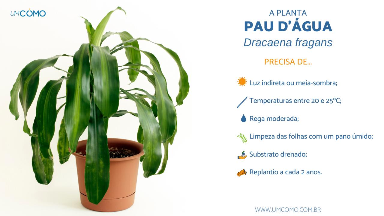 O pau d'água, ou dracena de Vênus, é uma planta tropical resistente de folhagem perene adequada tanto para interiores como exteriores da casa. O seu uso mais comum é o decorativo, além disso, é importante saber que ela é uma planta que pode chegar aos seis metros de altura (quando plantada diretamente no solo) devido à suas grandes folhas. Considere isso na hora de decidir qual será a sua localização. Aliás, a iluminação é fator determinante na coloração das folhas da planta pau d'água, quanto mais luz, mais claras e vice-e-versa.