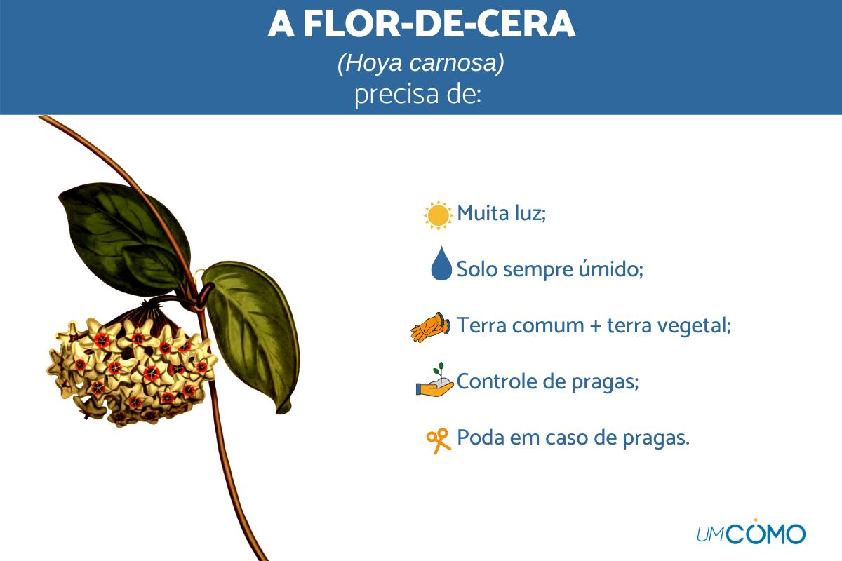 As flores-de-cera, de nome científico Hoya carnosa, são plantas ornamentais e trepadeiras originárias da China[1] que ganharam esse nome devido ao aspecto das suas flores, brancas ou rosadas, pequenas e de aparência cerosa, que surgem no verão e duram algum tempo espalhando um perfume adocicado. O cultivo desta planta não é difícil[2] e, além disso, é uma espécie bastante adaptada ao Brasil que não exige muitos cuidados, entretanto, essa é uma espécie que tem algumas especificidades sobre as quais devemos nos informar antes de iniciar o cultivo visando que nossa muda perdure e floresça anualmente.