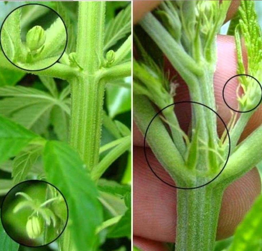 Você reconhece uma planta macho pois nas suas ramificações crescem pequenas bolas que parecem uvas que mais tarde serão sacos polínicos e nas plantas fêmeas crescem fios brancos.