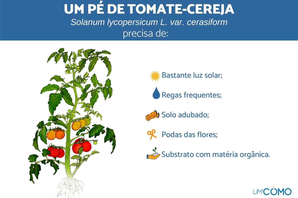 O tomateiro que dá origem ao tomate-cereja, de nome científico Solanum lycopersicum L. var. cerasiforme, é uma variação daquela comum de tomate, sendo um vegetal de grande importância na culinária brasileira já que o sabor e aparência delicados de seu fruto o tornam um alimento bastante consumido.[1] Se você preza por uma alimentação bastante saudável e nutritiva, o tomate é um alimento que não pode faltar na mesa e, para garantir sua presença nas refeições, nada melhor do que plantá-lo em casa, principalmente se você tiver uma casa com uma varanda ou um jardinzinho que apanhe sol. Além da praticidade de poder evitar idas ao mercados, outra vantagem de plantar vegetais em casa só assim sabemos exatamente o que comemos, já que muito do que compramos em mercados vêm com agrotóxicos e outros produtos que podem ser prejudiciais para nossa saúde.