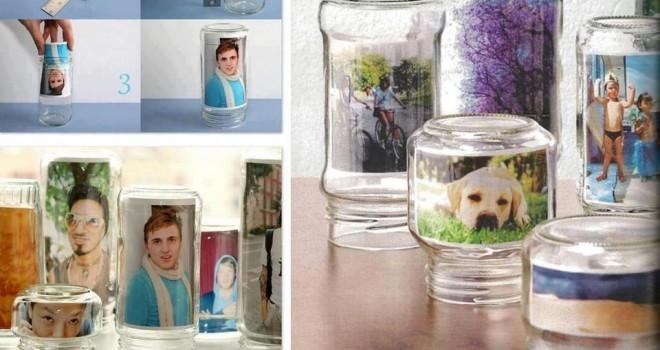 Outra maneira que você tem de decorar com garrafas de vidro é convertê-los em originais porta-retratos. Para isso só precisa escolher de seu álbum de fotos aquelas que quer colocar nos cantos de sua casa e introduzi-las dentro dos vasos de vidro. O resultado é original, diferente e totalmente ecológico.