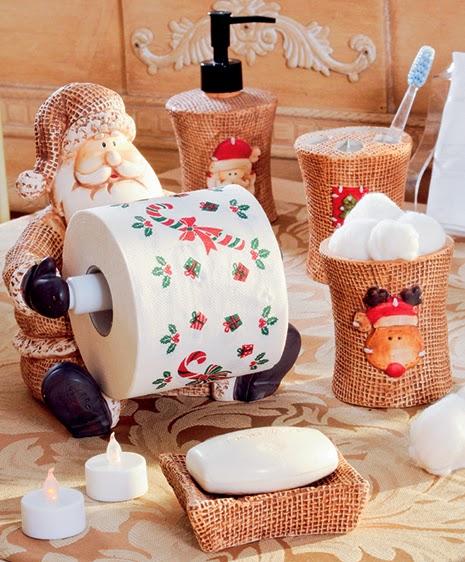 Sabe as saboneteiras e os recipientes para colocar as escovas de dentes? Com certeza que encontrará à venda muitos com motivos natalinos. Mas se não quiser gastar dinheiro, também pode optar por dar renovada nos seus, você pode forrá-los de tecido, feltro, EVA ou papel adesivo com motivos natalinos e já conseguirá ter uma decoração de Natal para o banheiro bem original.