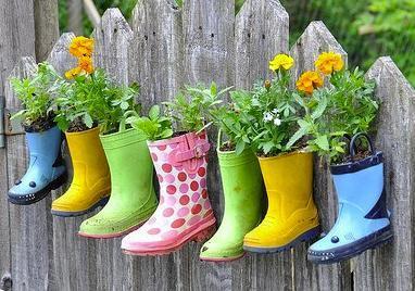 Uma forma muito original de decorar o jardim é usar vasos reciclados, neste caso a ideia que propomos é usar botas de água de cores muito vivas para dar alegria e vivacidade ao jardim. A única coisa que você deve fazer é fincar um prego na parede em forma de L e depois pendurar as botas, finalmente coloque a terra e as plantas dentro das botas.