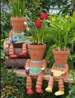 Para decorar o jardim desta forma tão original coloque as plantas e depois usando vasos menores, decore-os conforme a foto, para colar os vasos entre si, use cola permanente. Una os braços e pernas do menino vaso com um fio.