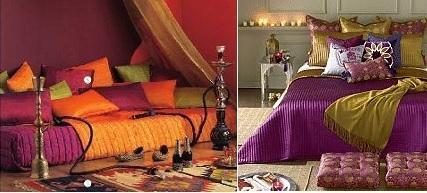 Cores do estilo árabe. São características as cores intensas e vibrantes com fortes contrastes entre elas. As cores ideais para conseguir o estilo árabe são rosados, laranjas, vermelhos em combinação com tons mais frios como violetas e azuis. Se não quisermos um quarto muito carregado, uma opção que funciona bem para dar luminosidade é a de usar cores claras e naturais como branco, bege, creme, etc. nas paredes, e dar a cor com os tecidos e outros complementos decorativos.