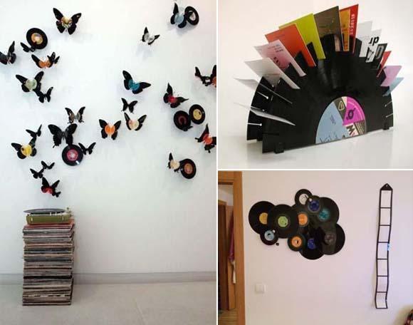 Você tem discos de vinil em casa que já não escuta ou que estão riscados? Então propomos-lhe uma solução muito divertida. Primeiro tire bem o pó e se tiver zonas manchadas, pinte de preto. Quando secar, poderá criar uma composição na parede colando e sobrepondo alguns discos sobre outros. Também pode recortar os discos e criar algumas formas com eles, para criar um mural de formas da natureza, que contraste com a artificialidade do material. Na imagem, poderá ver como ficam bonitas umas borboletas feitas com discos de vinal e coladas sobre uma parede branca.