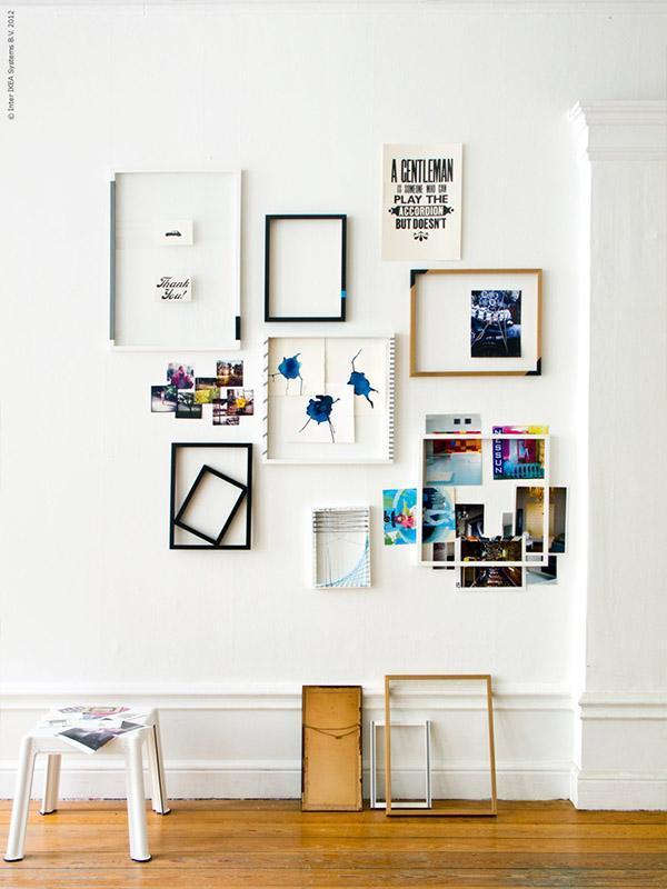 Tem um montão de porta-retratos em casa mas não usa? Costuma ser um típico presente mas, no final, se não gosta especialmente de mostrar as fotografias pessoais, propomos usar para decorar uma parede. Pegue em cada porta-retrato, esvazie o interior, tire inclusive o vidro se tiver um, e depois crie uma composição na parede brincando com as cores e as formas. Pode deixá-los sem fundo, colocar no centro recortes de imagens e inclusive escrever frases motivadoras. Tente combinar porta-retratos de diferentes estilos, formatos e tons para criar um mosaico na sua parede.