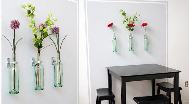 Propomos-lhe transformar garrafas de vidro que não usa mais em vasos de flores para pendurar na parede. É uma solução muito simples, elegante e que dará um toque muito refinado a qualquer parte da sua casa. Só precisa de algumas garrafas vazias para depois pendurar e criar uma composição reta ou diagonal na parede. Quando já estiverem colocadas, escolha algumas flores artificiais da sua preferência e coloque uma em cada um dos recipientes.