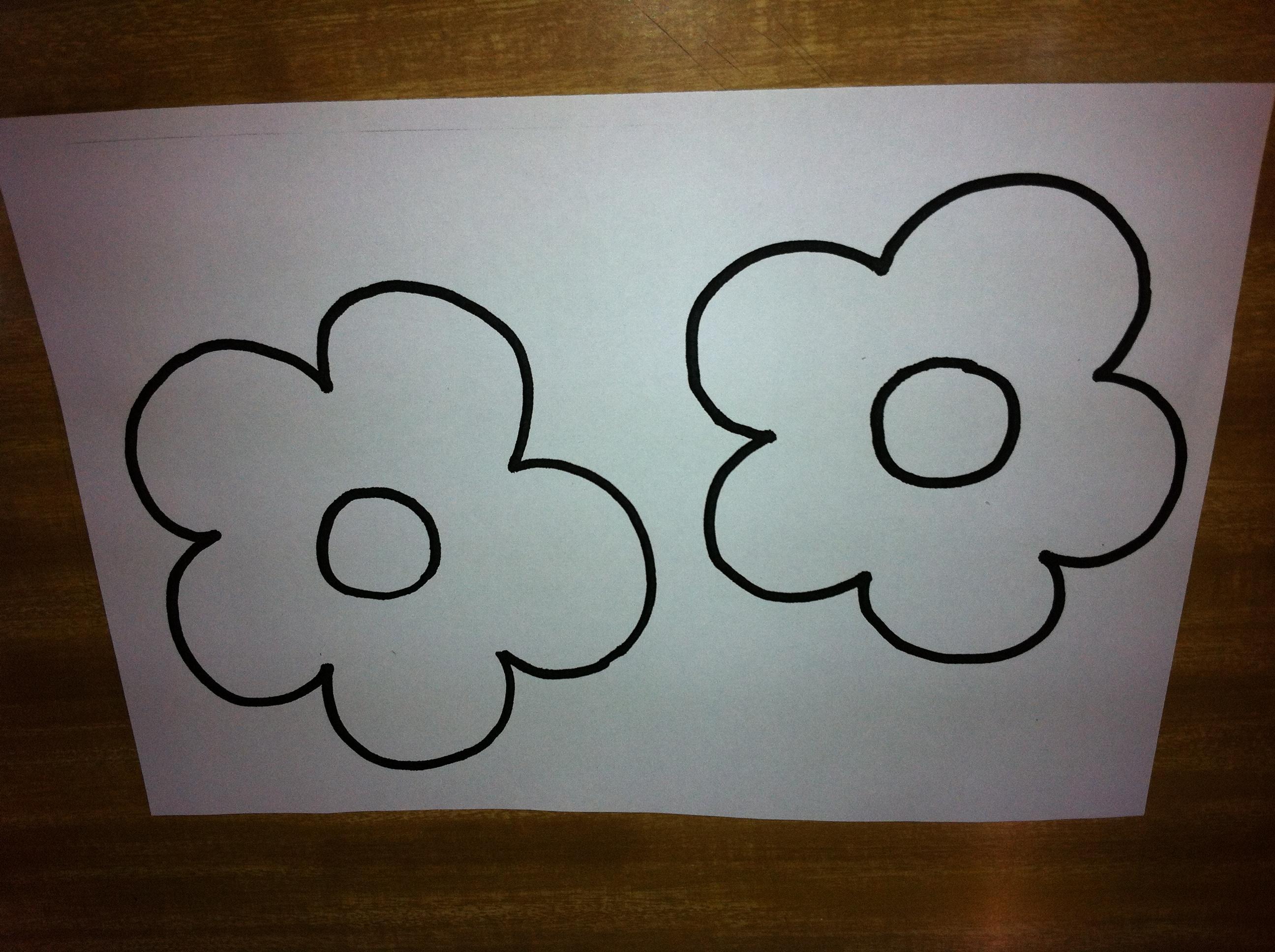 Com um marcador preto, desenhe flores brancas em papel ou cartolina branca. Se escolher papel tamanho A4, poderá desenhar quatro flores em cada folha (a foto representa meia folha). Se não lhe apetece desenhá-las, escreva flor de colorir num motor de busca, escolha uma e imprima-a. Agora só precisa que os seus filhos as pintem com cores ou marcadores.