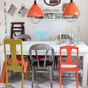 As cadeiras antigas também são perfeitas para decorar a sala de jantar com móveis vintage. Destacam-se as cadeiras envernizadas com tinta de cores vivas, os modelos de madeira envelhecida, as de madeira combinadas com aço, bem como a decoração de cadeiras com estofados em couro marrom, ou com tecidos coloridos e estampados florais e formas geométricas abstratas.