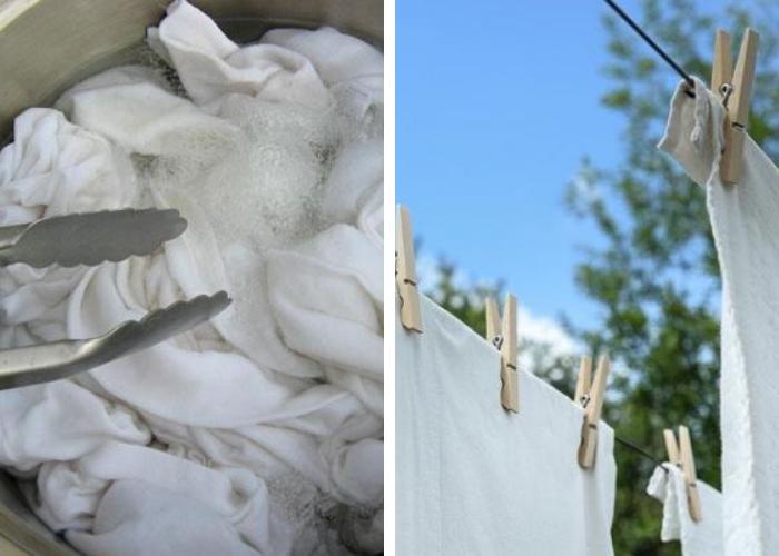 - Depois que a roupa foi "fervida", devemos repetir a lavagem, mas desta vez uma lavagem extensa com cloro e suavizante de roupa;