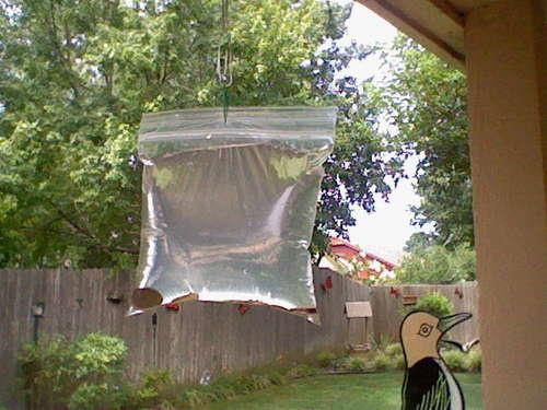 Deve colocar água em sacos de plástico transparente. Encha 3/4 do saco com água, deve fazer um nó para que a água não derrame. Em seguida deve pendurá-los no exterior da casa, próximo das janelas e portas. Lembre-se que deve utilizar sempre sacos de plástico transparente, desta forma a luz solar irá refletir-se na água e forma uns prismas. O efeito ótico que estes prismas fazem, repele as moscas.