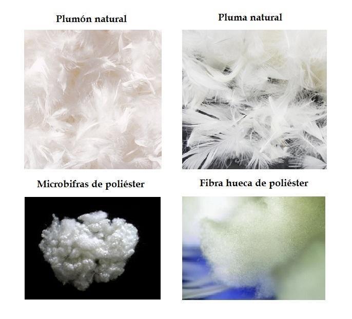 - Enchimentos sintéticos: Imitam a pluma natural e podem ser de fibras convencionais, de fibras ocas de poliéster ou de microfibras. Os de fibra oca de poliéster são muito transpiráveis e têm um correto poder isolante. Além disso, sua limpeza é mais fácil do que a dos de enchimento natural e são antialérgicos. Os enchimentos de microfibras também são de poliéster e antialérgicos, mas imitam um pouco melhor a pluma natural, tanto em volume quanto em poder isolante. São mais baratos que os de enchimento natural, mas apesar de proporcionarem um poder isolante menor, é uma opção muito boa.