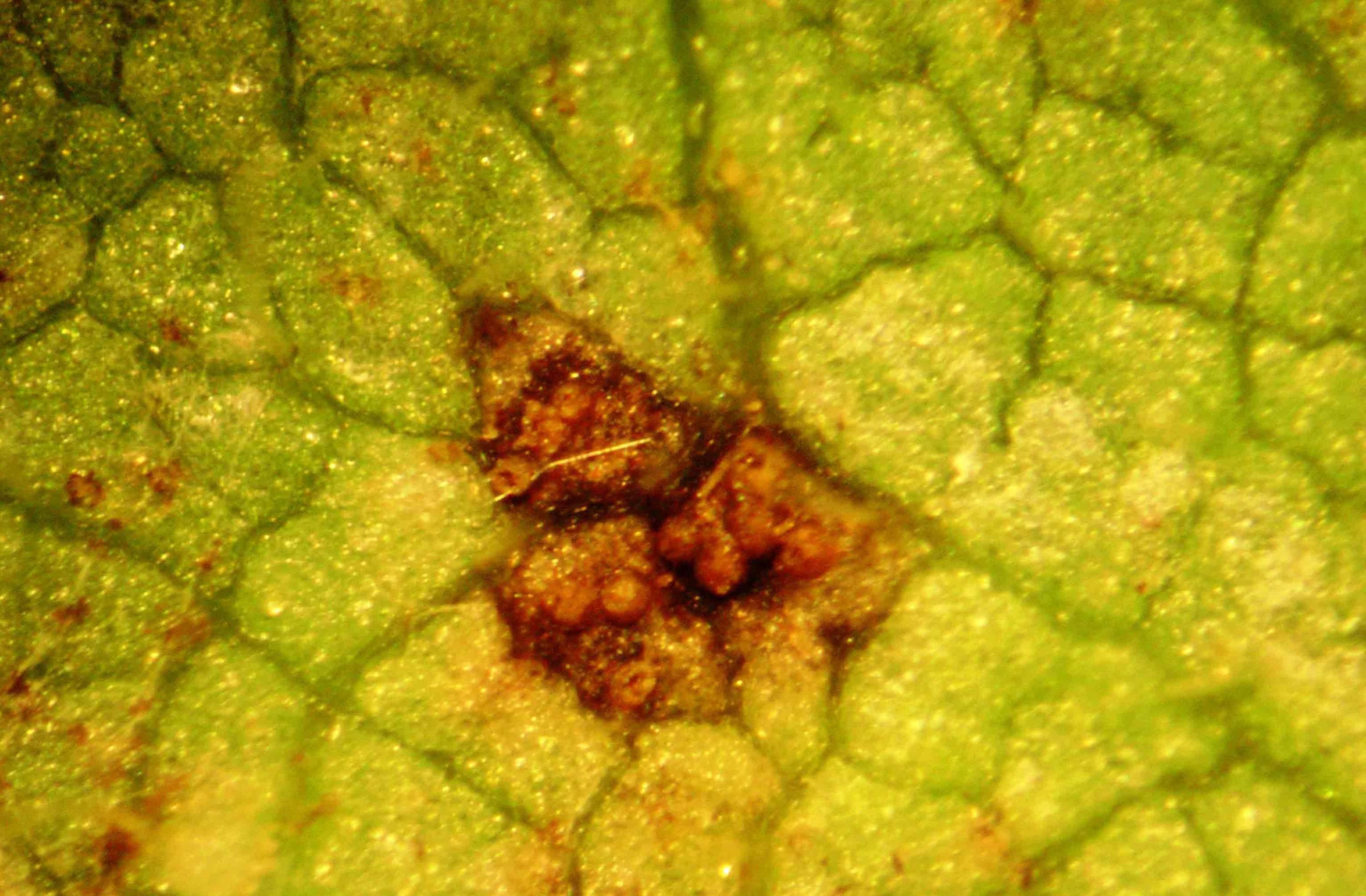 Algumas semanas depois do aparecimento das manchas, elas adquirem uma textura poeirenta que indica que o fungo se está reproduzindo. As folhas mais atacadas podem ficar deformadas e cair prematuramente.