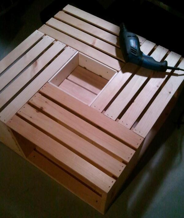 No centro ficará um buraco, você poderá mantê-lo assim ou, se preferir que fique com menos profundidade, corte um pouco de pallet com a medida do buraco e pregue-o na medida que pretender.