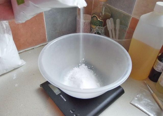 Para fazer as bombas de banho efervescentes, comece por medir o bicarbonato de sódio e o ácido cítrico em um recipiente. Peneire se necessário e misture-os bem juntos.