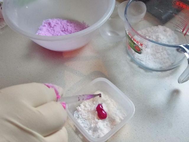 Adicione o corante às misturas, o corante é o que dará este toque único às bombas de banho efervescentes, portanto, recomendamos que a cor que escolher combine bem com a decoração do seu banheiro.