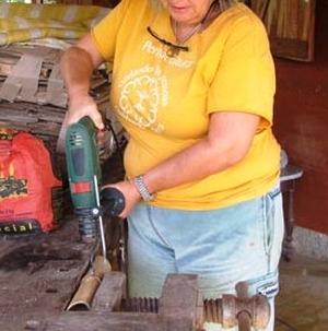 Desenhe marcas de 15,25 cm; 30,35 e 60,95 cm a partir da extremidade das varas. Após, faça furinhos suaves nestas marcas para que o bambu não rache e estrague o trabalho. Depois de concluídos os furos em todos os bambus, aumente a força com a furadeira para perfurá-los até o fim.