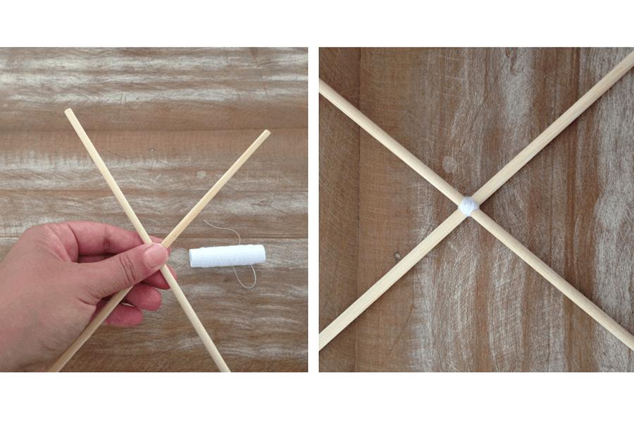 Depois de fazer toda a planificação, comece por preparar o suporte do móbile. Para isso, coloque um palito de churrasco sobre o outro, formando um X, e amarre com linha ou fio nylon. Para isso, dê várias voltas na junção dos palitinhos até o suporte ficar bem firme. Em seguida, dê um nó e corte o excesso de fio, deixando uma alcinha para pendurar o fio no teto ou berço do bebê.