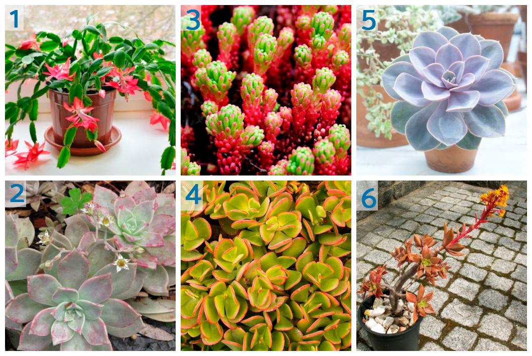 - Gênero Sedum: muitas suculentas do gênero sedum são características pelas cores diferentes, como é o caso da Sedum cauticola (rosada), Sedum clavatum (esbranquiçada), Sedum compactum (amarelada), Sedum lydium (manchas vermelhas), Sedum oreganun (folhas verdes brilhantes), Sedum pluricaule (bordas rosadas), Sedum lucidum (arroxeada), Sedum nussbaumerianu (pontas amarronzadas), dentre outras. As Sedum, assim como muitas suculentas, são conhecidas pela boa resistência a temperaturas bruscas;