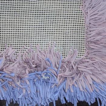 Passemos então à parte prática: amarre cada uma das tiras de retalho aos buraquinhos da tela. Não há uma regra que dite a distância que cada nó de retalho deve ter entre os outros, mas é aconselhado que fiquem próximos para não originar buracos no tapete.