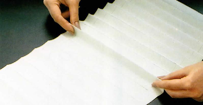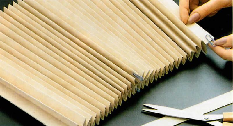 Coloque o papel com o lado errado para cima. Com os dedos juntos dobre ao longo de cada linha de dobra. Vire o papel e fazendo coincidir as linhas de dobra adjacentes, dobre de novo para formas pregas de acordeão de 2 cm.