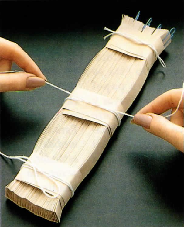 Forme um grupo apertado com o papel dobrado e prenda com tiras de papel e com um cordel (o papel evita que o cordel deixe marcas). Deixe assim o papel durante várias horas para marcar bem as dobras.