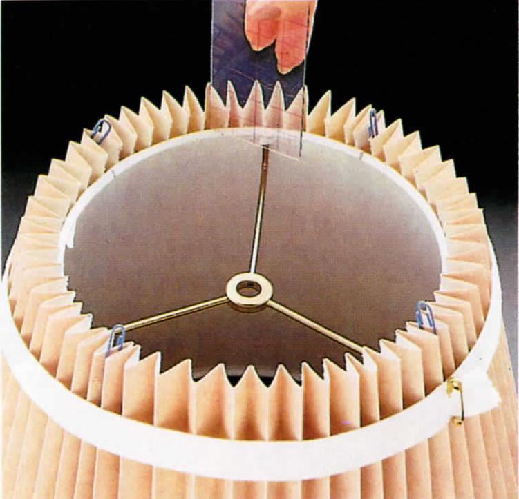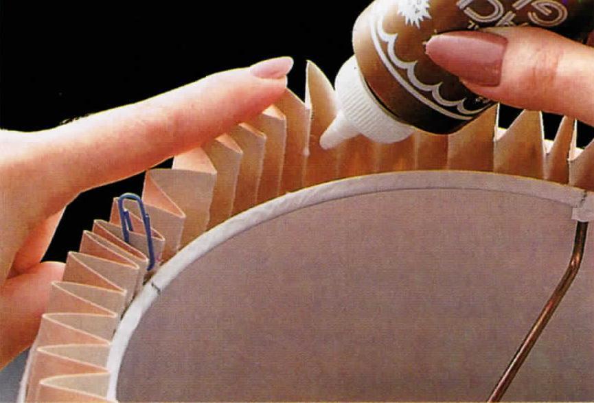 Ajuste sobre o abajur a base de papel dobrado alinhando os clips com as listas a lápis. Para mantê-lo na sua posição deverá colocar dois elásticos na extremidade superior e inferior do abajur. Ajuste as pregas para que sobressaiam do abajur 1,5 cm.