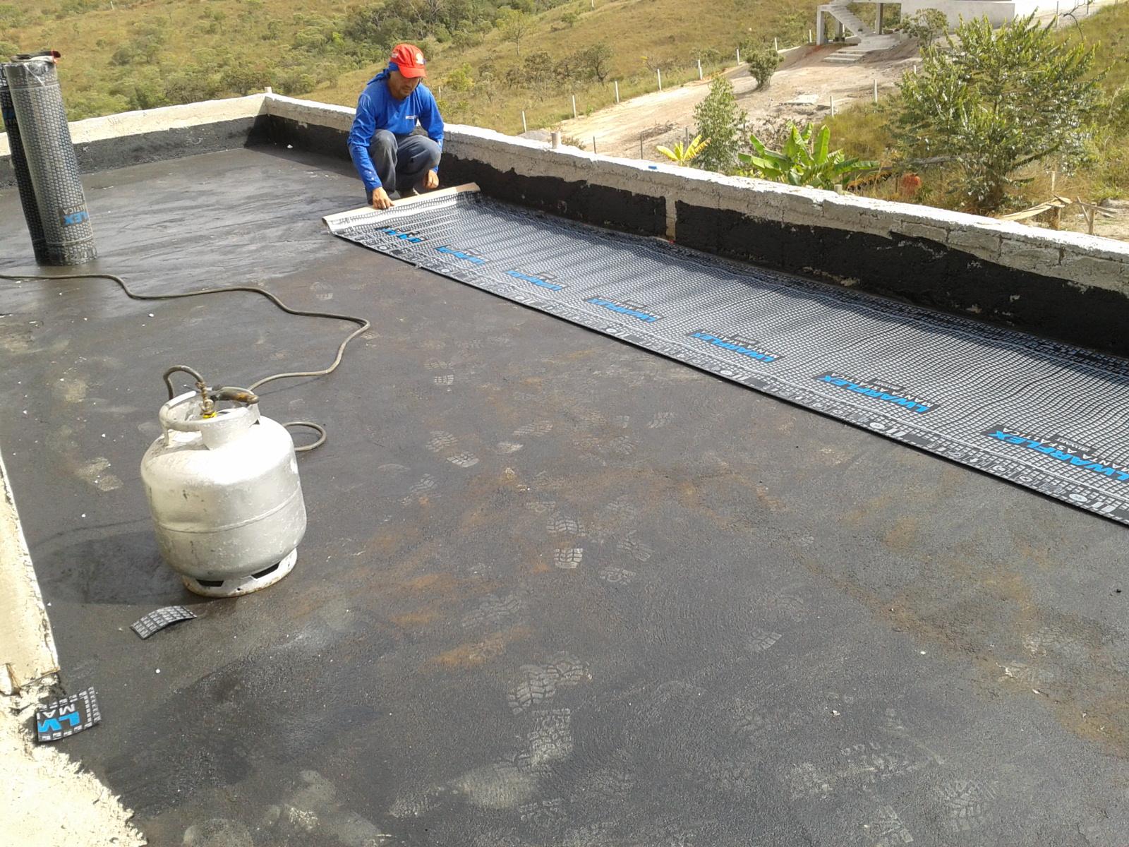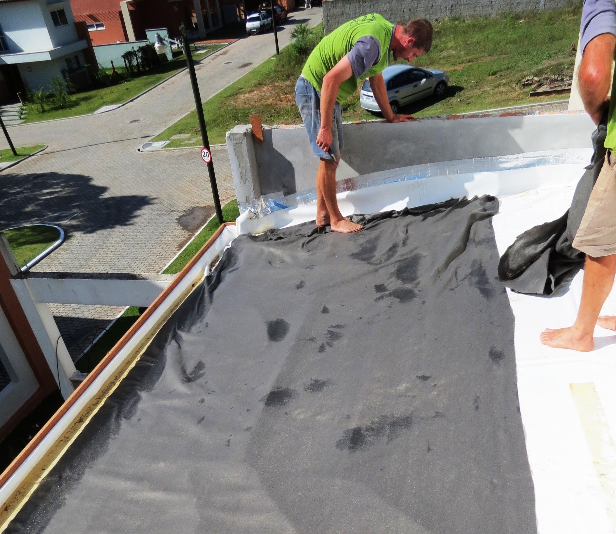 Depois da superfície impermeabilizada, deve-se estender uma manta de bidim. Esta manta serve para filtrar a água, evitando que as partículas de terra ou as raízes passem pela tubulação de queda da água da chuva.