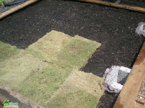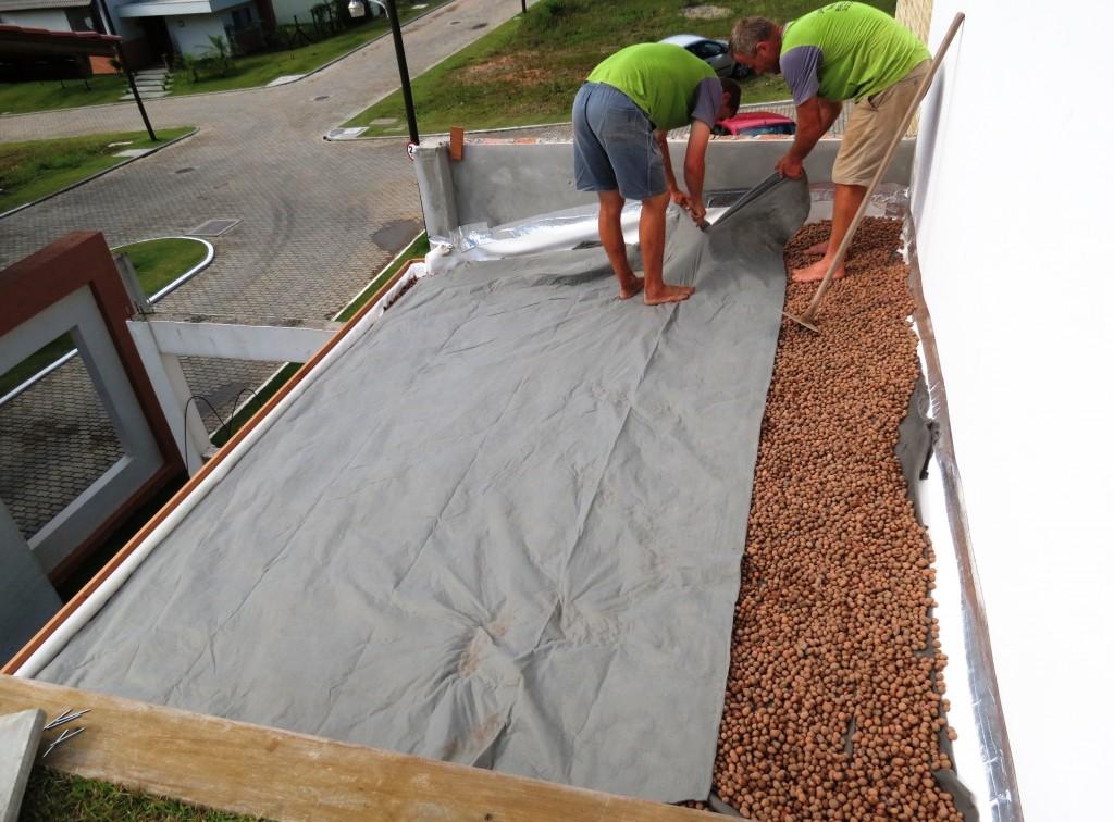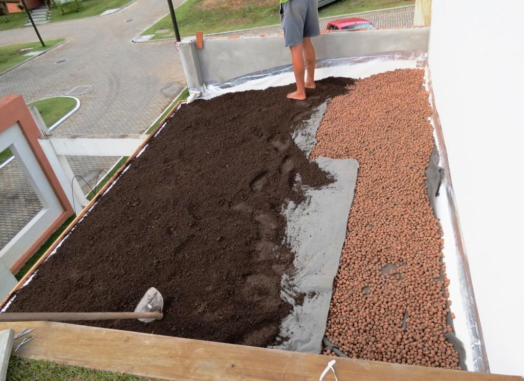Sobre a manta de bidim, coloca-se uma camada de argila expandida uniforme, de cerca de 7 cm de espessura. A camada de argila irá impedir o apodrecimento das raízes e facilitar o escoamento da água da chuva.