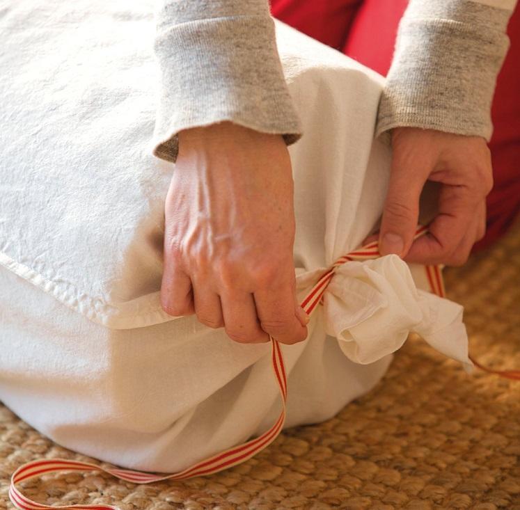 De seguida, faça um rolo com o tapete e o lençol. Assim ocupará menos espaço e será mais fácil de guardar. Lembre-se: o lençol que sobrar ao enrolar o tapete, deve dobrá-lo