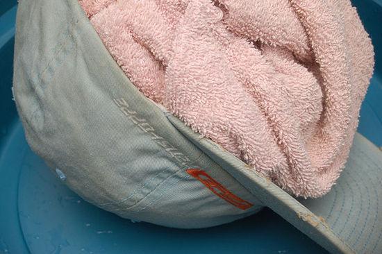 Deixe o chapéu algum tempo de molho e provavelmente será necessário esfregar a parte interior dianteira onde se une a viseira ao chapéu ou as laterais do chapéu, para acabar com marcas de suor.