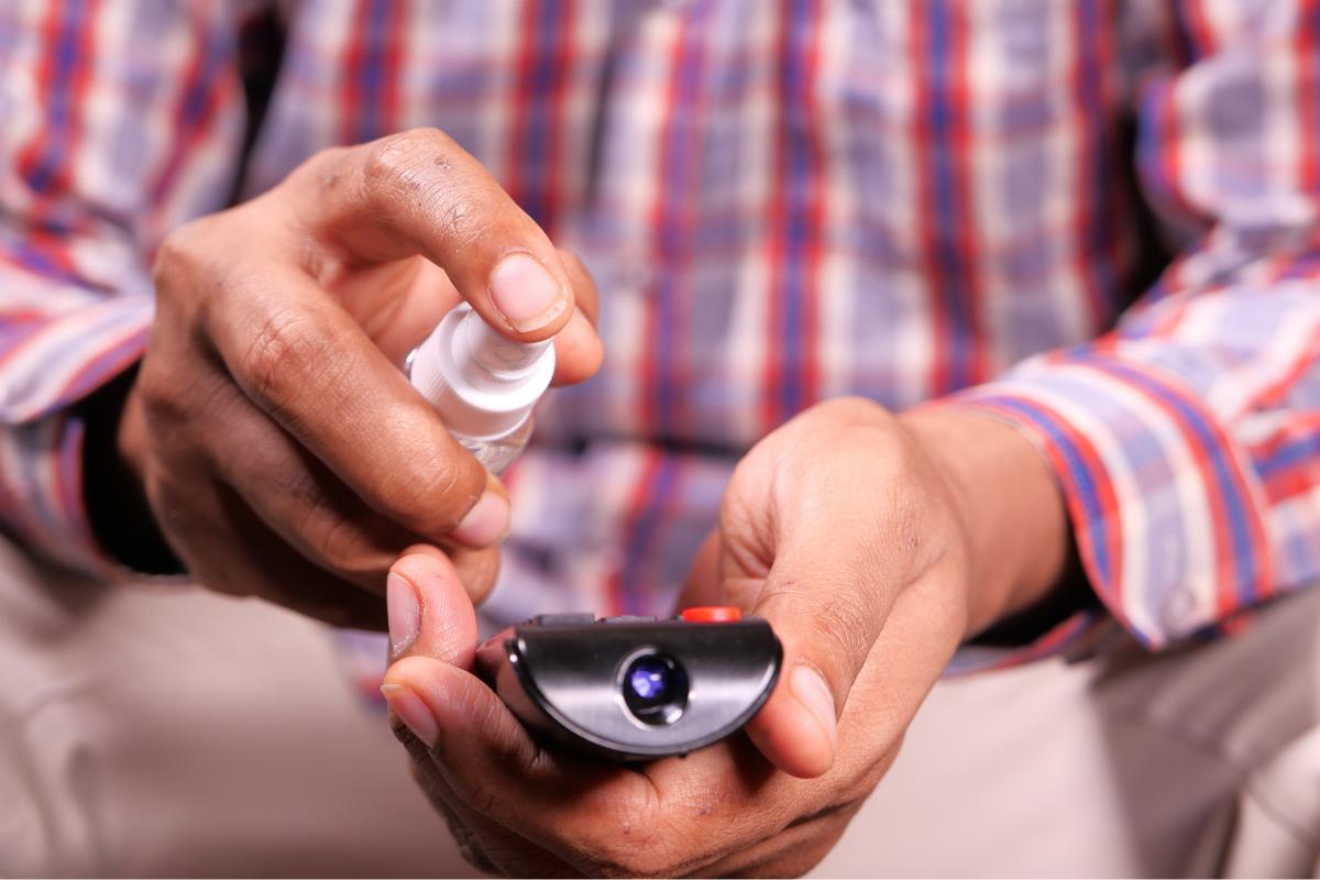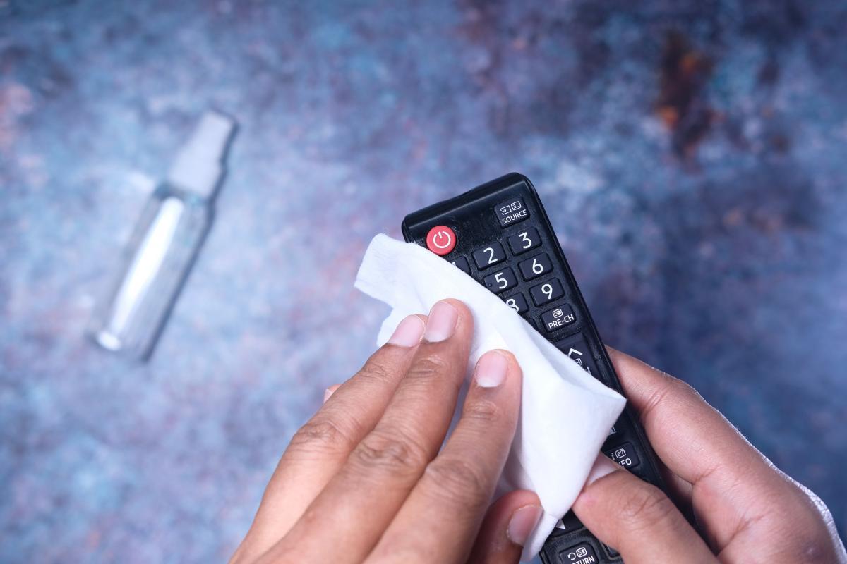 Você pode usar um produto de limpeza que não seja agressivo para não danificar o plástico do controle. Isso ajudará a eliminar micróbios e bactérias acumulados. Existem produtos que são específicos, mas o mais indicado é o álcool, pelo menos para a parte externa. Uma boa opção é umedecer o pano com álcool isopropílico, sem encharcá-lo. O álcool é ideal porque pode dissolver qualquer sujeira ou gordura que possa estar acumulada. Desta forma não ficará pegajoso nem danificará o plástico.