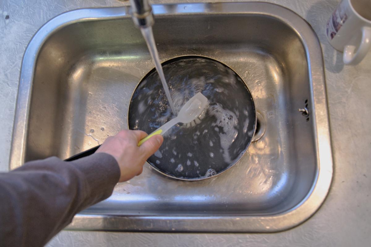- Deixe agir por alguns minutos e esfregue suavemente (sem apertar) com uma escova ou esponja antiaderente.