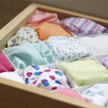 Existem no mercado várias divisórias para gavetas, procure aquelas com formato colmeia, como mostramos na imagem ao lado, ou outras com pequenos espaços, de forma a manter cada calcinha em seu lugar.