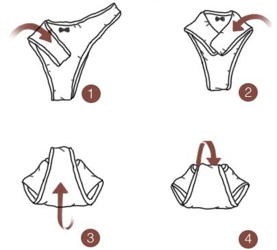Em primeiro lugar há que saber como dobrar as calcinhas. Para isso, pegue numa calcinha e dobre para dentro ambas as laterais, sem seguida pegue na parte inferior e dobre-a para dentro da parte superior, encaixando entre a parte da frente e a de trás. Se estiver com dúvida em relação a este processo, dê uma olhada na imagem ao lado.