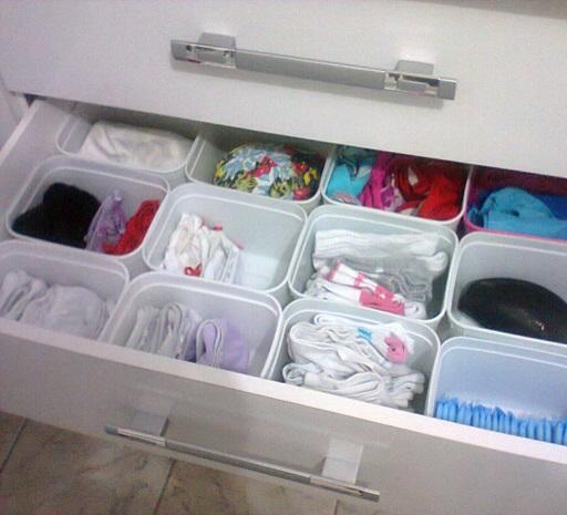 Por outro lado você também pode manter suas calcinhas arrumadas sem necessitar de comprar uma divisória. Pode aproveitar, por exemplo, caixas de sorvete usadas ou construir você própria, com cartão, uma estrutura de arrumação parecida à anterior. Vale tudo desde que caiba na gaveta.