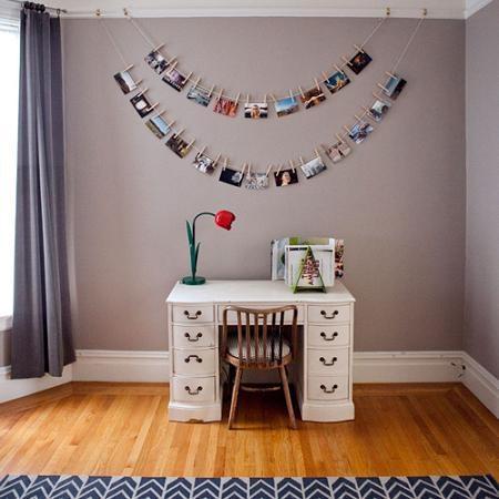 Uma vez que tenha as cordas penduradas, é hora de colocar as fotos. Para isso, só terá que conseguir uns pregadores de pendurar a roupa (podem ser de plástico e coloridos ou, se preferir, de madeira) e ir distribuindo suas imagens favoritas por toda a corda. Como vê, é muito simples de fazer e o resultado é genial.