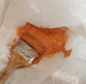 Para guardar os pincéis você pode fazê-lo de duas formas, limpar bem o rolo e pincéis ou como mostra a foto, você pode pôr tinta no pincel e envolver com um plástico branco. Se você vai usar a mesma tinta no dia seguinte é um bom truque.