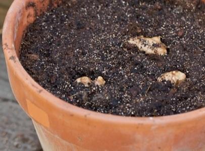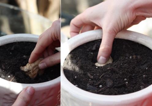 Enterre no vaso os rizomas de gengibre, a cerca de 9 ou 10 centímetros de profundidade, e com os botões para cima. Volte a regar até que o substrato fique úmido mas não molhado.