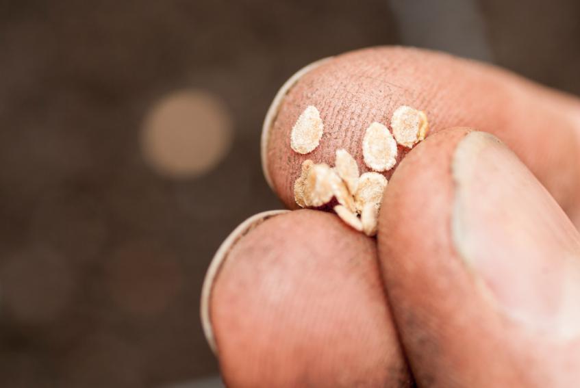 - Acalque a terra com a mão e espalhe as sementes pela superfície deixando uma certa distância entre elas.