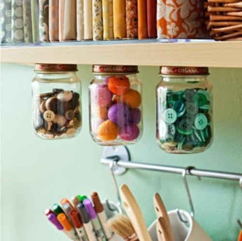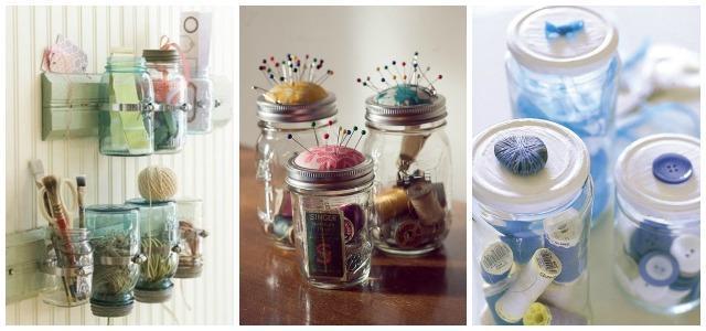 Os frascos de vidro que sobram em casa também podem ser utilizados para organizar nossa caixa de costura. Podemos por em um dos frascos os novelos, em outro podemos por as agulhas e alfinetes e em outro os carretéis de linha. Sem dúvida, é uma maneira original de manter nossos trabalhos de costura organizados.