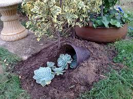Se tem um jardim de terra ou grama e seu vaso quebrou mais ou menos no meio, pode colocá-lo sobre a terra parecendo que a metade que falta está enterrada no solo. Conseguirá um efeito muito original para seu jardim.